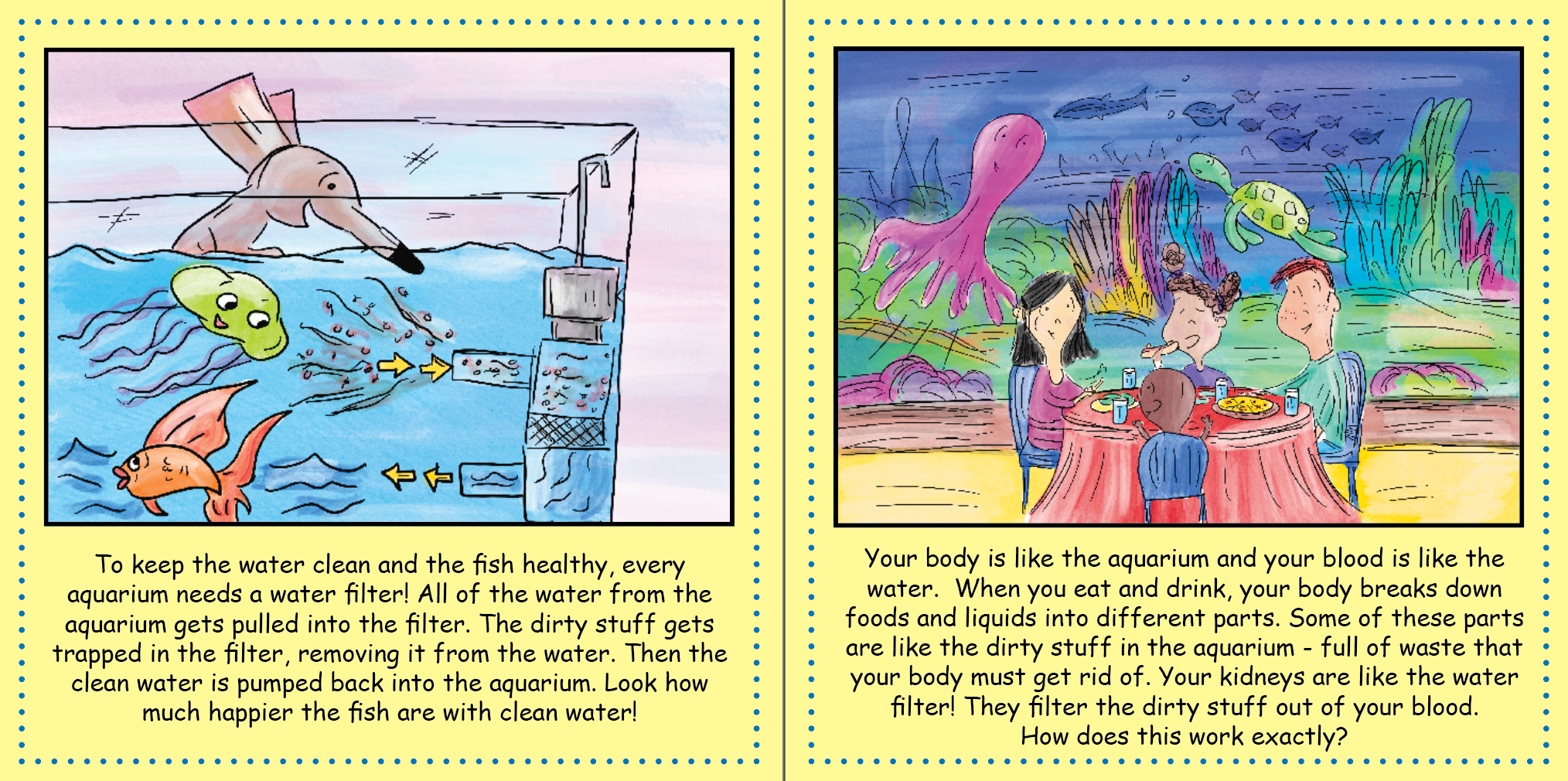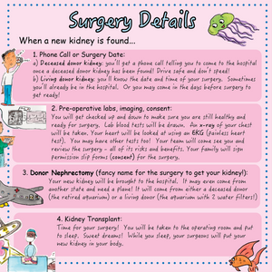 Kidney Transplant: Time for a New Filter! invites children, teens, and the adults who care for them into the world of kidney transplantation with clear, friendly language and bright illustrations.  Using an aquarium-and-water-filter analogy, the book explains what kidneys do, why they sometimes fail, and how dialysis can help while you wait for a new “filter.”   Readers learn about both deceased-donor and living-donor kidney transplants—complete with why matching matters and how each generous gift is found.   Step-by-step pages walk kids through the day of surgery, show where the new kidney goes, and outline what to expect during the hospital stay and recovery.   A handy “Doctor Words” glossary translates tricky medical terms like dialysis, PRA, and immunosuppression into kid-friendly definitions, while vibrant diagrams make every concept easy to see and remember.