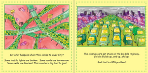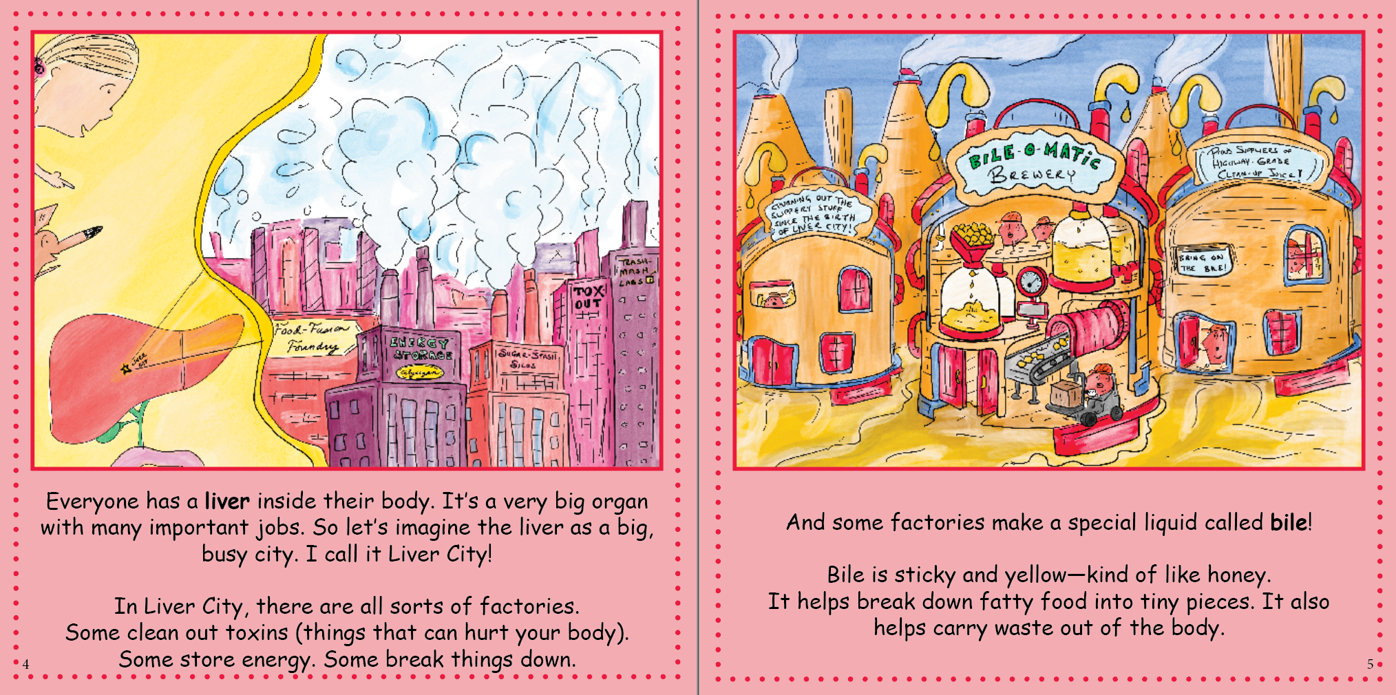 Following Molly, the book’s cheerful narrator, children learn how bile works, what happens when it gets “stuck in a traffic jam,” and how doctors, nurses, and families come together as a team to help Liver City heal. Playful illustrations—like bile “cleanup cars” stuck on the “Big Bile Highway,” and crumbling city buildings overwhelmed by bile buildup—make complex medical ideas instantly relatable.