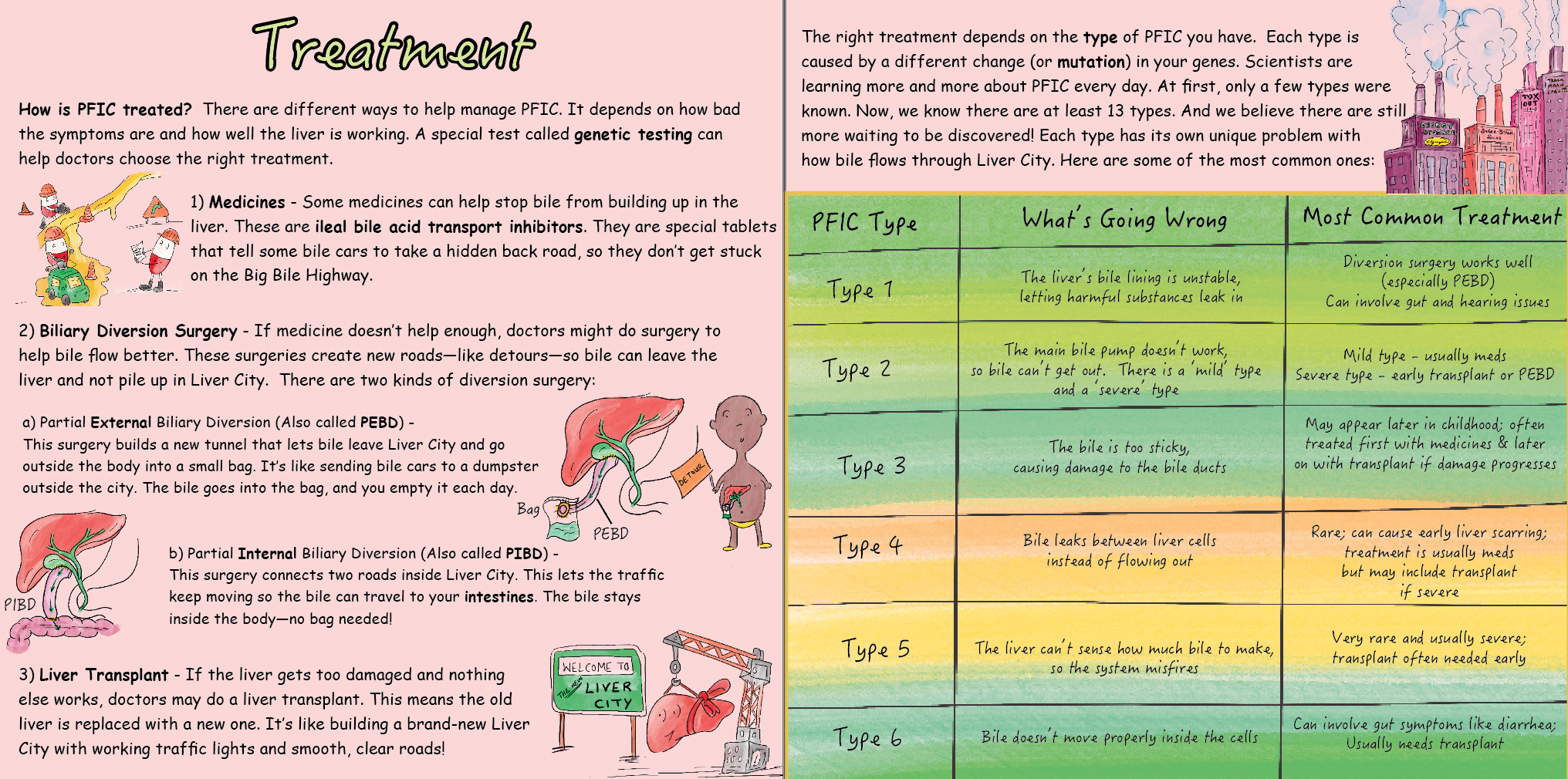 Using approachable visuals and simple explanations, the book covers: what PFIC is, symptoms, causes, variation in PFIC types, and treatment options. Also included are family stories from real children and siblings living with PFIC, and a detailed ‘Doctor Words’ glossary explaining complicated medical terms in plain language.
